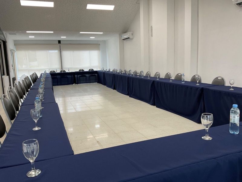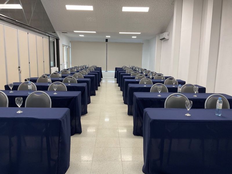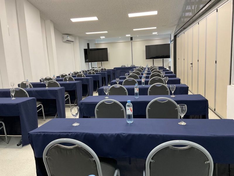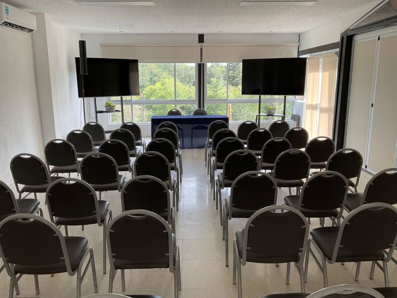 - Meeting room equipped with projector, screen, flip chart, two 75" LED TVs, handheld and headset microphones, audio system, and Wi-Fi connection.